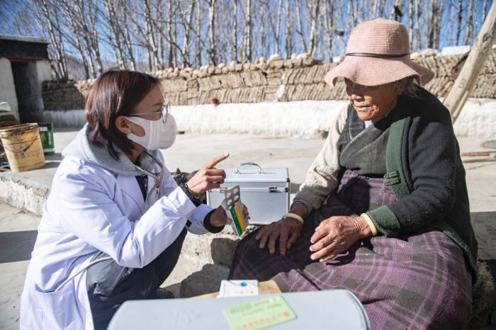 倉木拉(左)叮囑村民要按時(shí)吃藥(2021年12月21日攝)。新華社記者 孫瑞博 攝