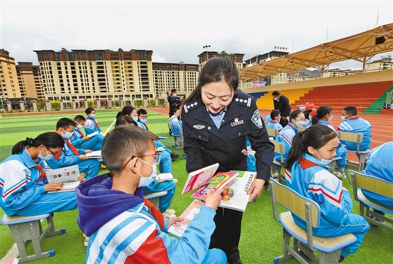 圖為民警給學(xué)生分發(fā)書籍。記者 唐斌 攝