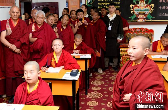 6月16日,班禪來到西藏佛學(xué)院少年活佛班,了解少年活佛們的學(xué)習(xí)、生活情況。中新社發(fā) 李林 攝