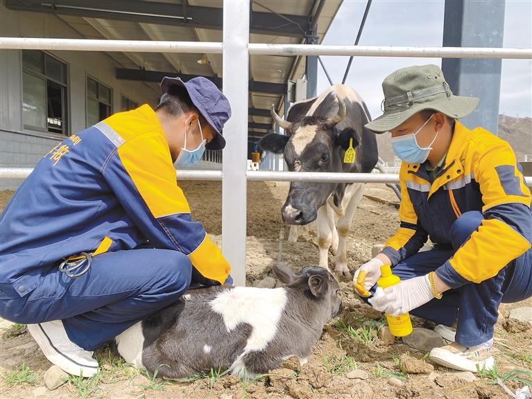 走進格桑塘現(xiàn)代農(nóng)牧產(chǎn)業(yè)示范園,工作人員強久和土旦達(dá)杰嫻熟地在給小奶牛的肚臍消毒,這是他們工作3年時間順利接生的第43頭小奶牛。