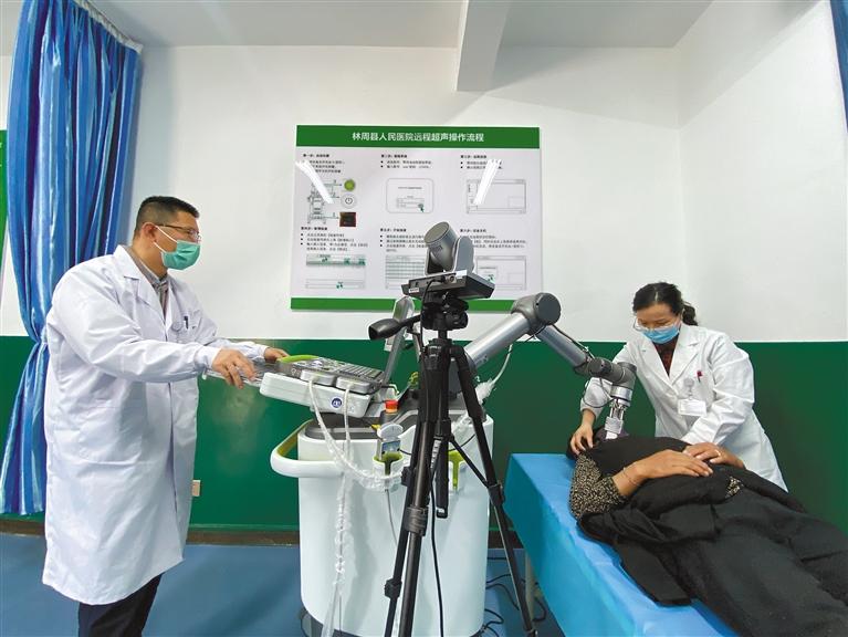 蘇州市援藏工作組引進第一臺5G遠(yuǎn)程超聲機器人。圖為醫(yī)生使用遠(yuǎn)程超聲機器人為患者檢查。