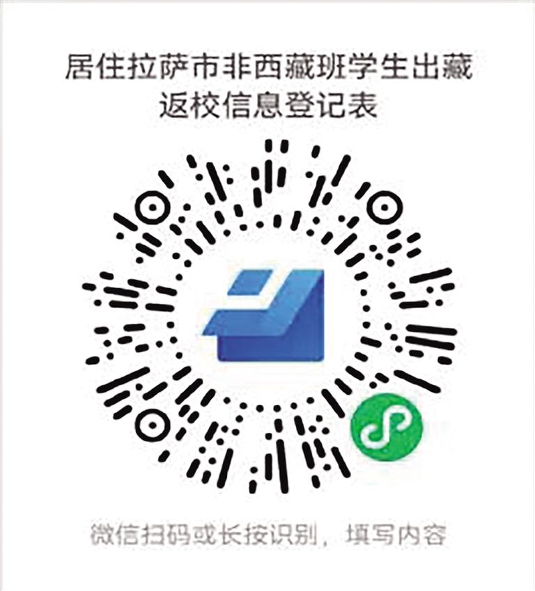 根據(jù)拉薩市委、市政府和自治區(qū)教育廳部署安排,為準確掌握學生出藏行程規(guī)劃,為民航、鐵路等交通部門調(diào)配運力提供參考依據(jù),拉薩市教育局需精準掌握居住在拉薩市的區(qū)外就讀西藏籍大學生、區(qū)外非西藏班就讀西藏干部職工子女、區(qū)外就讀進城務工人員子女、旅居區(qū)內(nèi)的區(qū)外學生出藏相關信息,請廣大家長、學生積極配合,掃描以下二維碼,填報出行信息;下載健康監(jiān)測檔案,于出藏7天前填寫健康監(jiān)測。