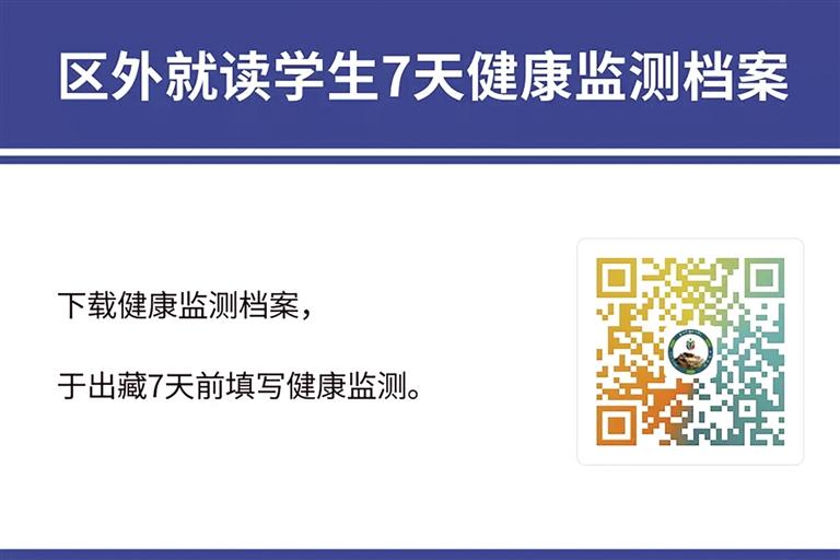 另外,居住在拉薩市的區(qū)外就讀西藏籍大學生、區(qū)外非西藏班就讀西藏干部職工子女、區(qū)外就讀進城務工人員子女、旅居區(qū)內(nèi)的區(qū)外學生出藏返校,須嚴格執(zhí)行《西藏自治區(qū)高風險區(qū) 中風險區(qū) 低風險區(qū)疫情精準防控辦法》,關于“高風險區(qū)實行封控管理,原則上人員及車輛不進不出;中風險區(qū)實行‘人不出區(qū)、嚴禁聚集’,原則上人員及車輛只進不出;低風險區(qū)內(nèi)人員原則上非必要不離開本區(qū)域,如因就醫(yī)、特定公務等確需出入的,須持24小時內(nèi)核酸檢測陰性證明”要求。在此提醒廣大家長和學生,出藏返校須咨詢現(xiàn)居住地所在村(居)委會防疫要求,嚴格落實“三天兩檢”核酸檢測、藏易通綠碼等監(jiān)測程序,密切關注民航、鐵路等交通部門出行要求和目的地疫情防控政策,在滿足出藏防疫規(guī)定的前提下,進行出藏信息登記和“7天健康登記”(詳見文末二維碼),確定出藏行程。