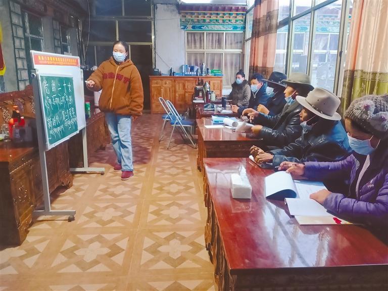 謝通門縣政協(xié)辦駐塔定鄉(xiāng)普村工作隊隊員為村干部授課。