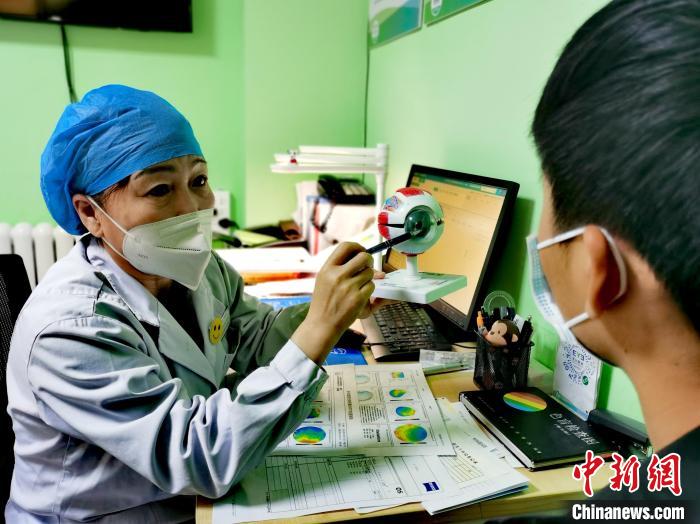 圖為青海省一醫(yī)療機(jī)構(gòu)眼科專家向患者講解近視問(wèn)題?!?zhí)砀!z