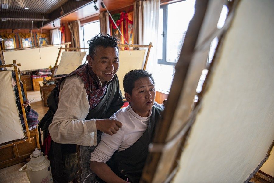 距離學(xué)校15分鐘車程,日喀則市城區(qū)北郊一座藏式建筑里,學(xué)徒們正聚精會神地作畫。洛桑旦達穿行于畫板之間,不時停下腳步細心指點。