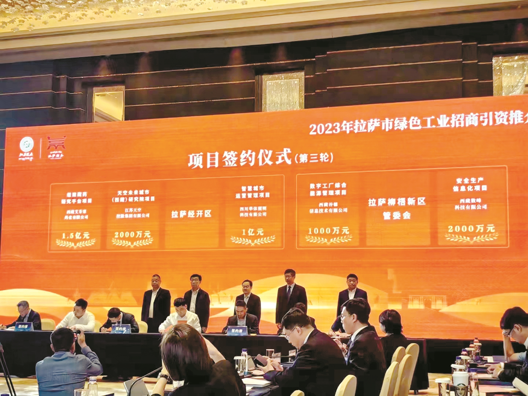4月17日,2023年拉薩市綠色工業(yè)招商引資推介會暨項目簽約儀式在南京舉行,活動由拉薩市人民政府、西藏自治區(qū)招商局、江蘇援藏前方指揮部主辦,拉薩市商務(wù)局、拉薩經(jīng)濟技術(shù)開發(fā)區(qū)聯(lián)合承辦。江蘇省商務(wù)廳副廳長倪海清、江蘇省工業(yè)和信息化廳二級巡視員宋旭東、西藏自治區(qū)招商局副局長次旦格來應(yīng)邀出席活動并致辭,簽約企業(yè)代表、拉薩市各縣(區(qū))、經(jīng)濟功能園區(qū)分管招商工作負(fù)責(zé)人以及知名企業(yè)代表近140余人參加推介會。本次推介會共簽約項目15個,協(xié)議投資達(dá)32.3億元。