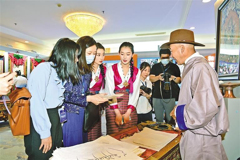 圖為在“2023·中國(guó)西藏發(fā)展論壇”上,西藏書(shū)法家向嘉賓介紹藏文書(shū)法。記者 旦增西旦 攝