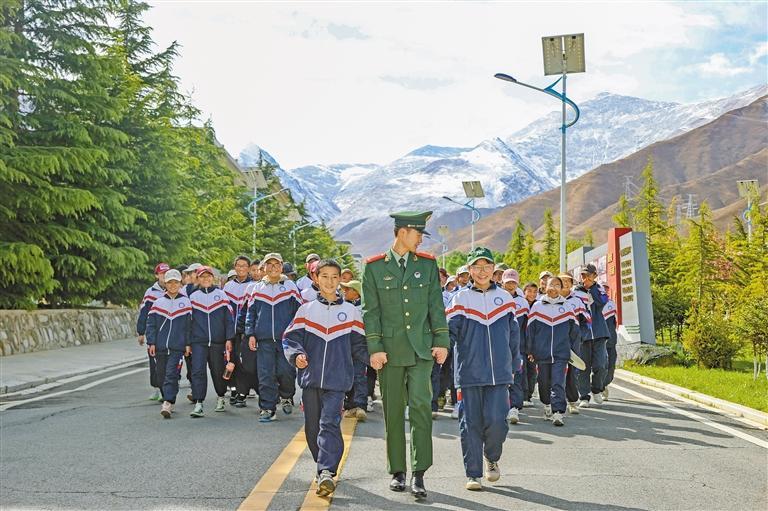 武警官兵帶領學生參觀營區(qū)。索朗旺堆 記者 旦增蘭澤 攝
