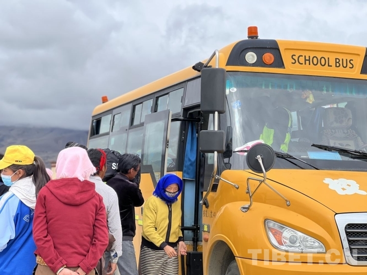 上午十一點,穿著牧區(qū)藏袍、頭戴淺色頭巾的婦女和紅色“扎秀”(辮尾)的男士背起牛羊毛編織的背包,牽著自家小孩的手紛紛到達集合點。“校車來啦!”學生們在村委會院子里自覺排起了隊。