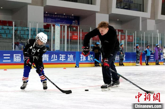 圖為外籍教練教學(xué)冰球射門。薛蒂 攝