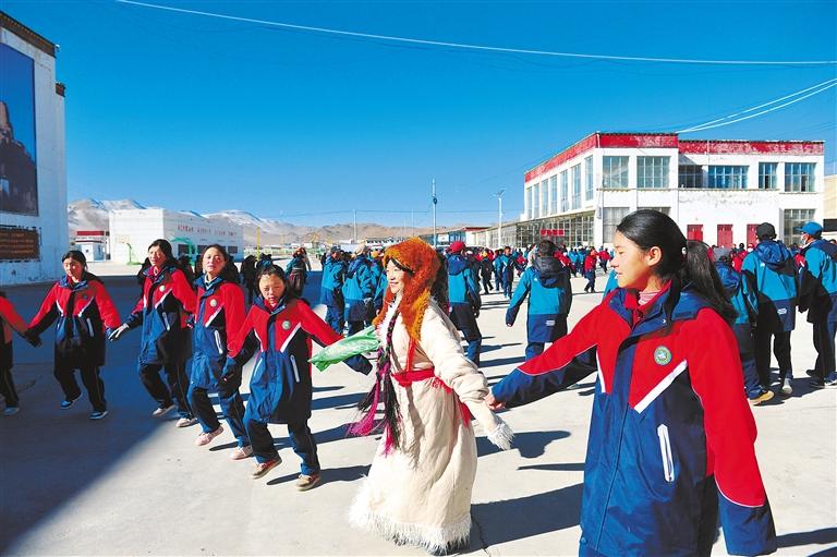 措勤縣中學黨建辦副主任次旺曲珍告訴記者,將非遺“磁石帕卓”改編成“磁石彈舞”課間操,主要就是以一種新潮的形式讓學生在健身的同時,充分感受非遺文化魅力。這不僅豐富了學生的課間活動,鍛煉了學生身體、培養(yǎng)了民族情感、增強了民族自信心,而且使措勤縣特有的非遺文化得到了傳承。