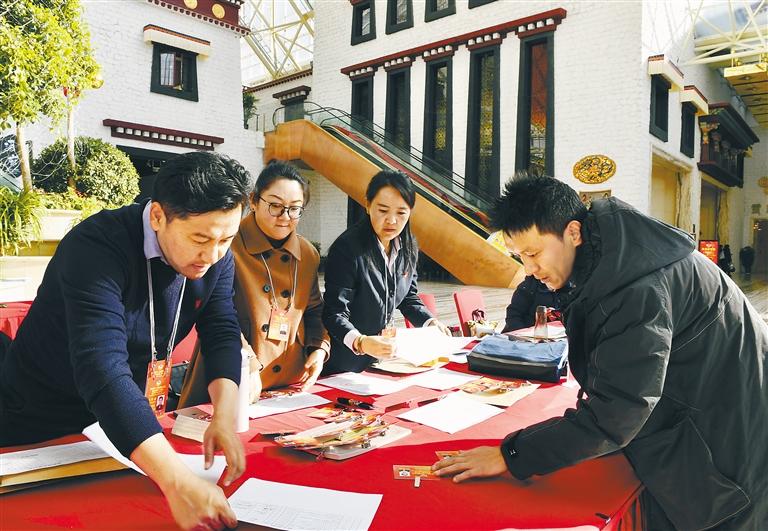 圖為參加西藏自治區(qū)兩會(huì)的政協(xié)委員在駐地領(lǐng)取證件和會(huì)議資料。記者 旦增蘭澤 攝
