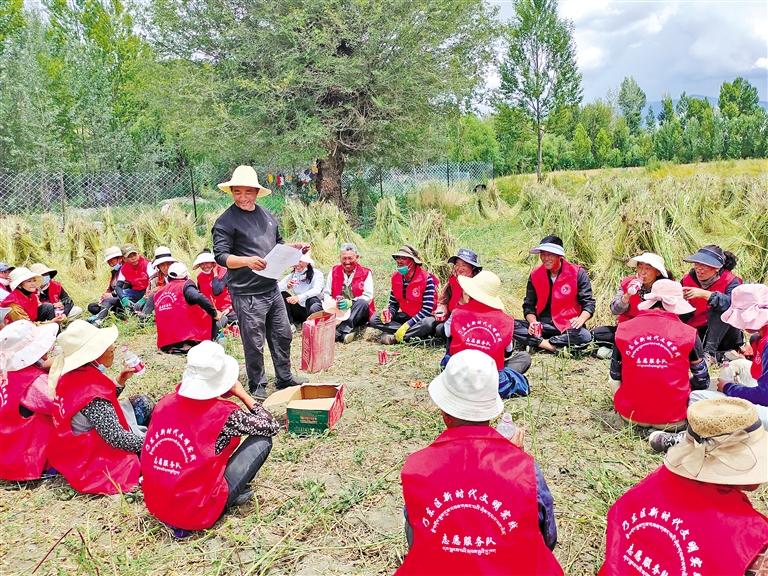 圖為乃東區(qū)新時代文明實踐志愿服務(wù)隊在田間地頭學(xué)習(xí)強(qiáng)農(nóng)惠農(nóng)政策。記者 劉楓 攝