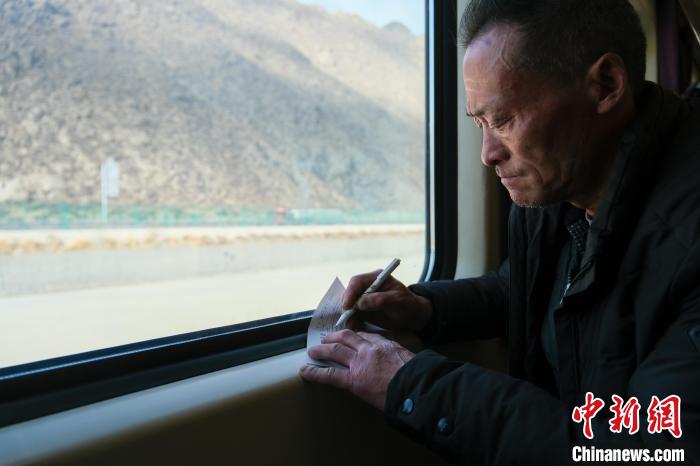 2月1日,Z166次列車上,返鄉(xiāng)的魏恩銀在填寫“旅客健康登記卡”,這是高海拔青藏鐵路上旅客獨有的健康登記措施?!≈行律缬浾?江飛波 攝