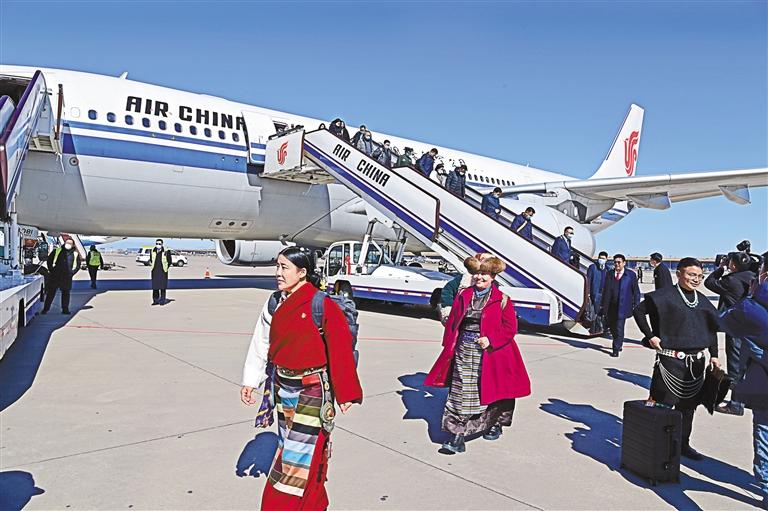 圖為西藏參加全國兩會(huì)的代表委員乘機(jī)抵達(dá)北京。記者 旦增西旦 攝