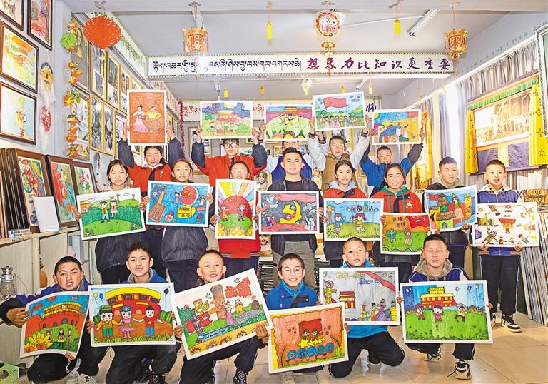 圖為桑日縣中學(xué)美術(shù)興趣社團(tuán)的孩子們展示以“鑄牢中華民族共同體意識(shí)”為主題的繪畫(huà)作品。 次仁龍布 記者 洛桑 攝