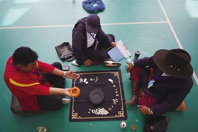 當(dāng)日,“吉韌”“秀茲”等項(xiàng)目一同開賽。 “吉韌”也叫藏式克郎球,是藏族的一種彈指運(yùn)動(dòng)。比賽在一張邊長約1米的正方形木桌球臺(tái)上進(jìn)行,球臺(tái)四角有4個(gè)小洞,黑、白兩種扁圓形球子各9個(gè),另有1個(gè)紅色球子放置在球臺(tái)中心,1個(gè)白色母球供雙方彈擊球子所用。