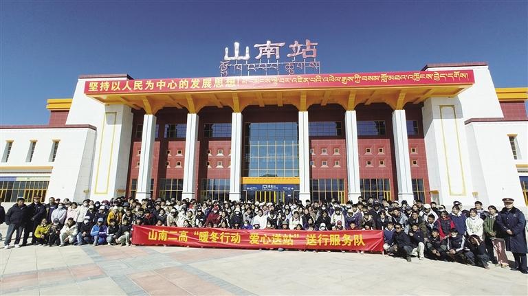 山南市第二高級中學“暖冬行動 愛心送站”送行服務隊和學生們合影。 圖由格桑央金提供
