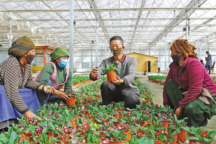 圖為在林周縣陽(yáng)光溫室示范園區(qū),技術(shù)人員在指導(dǎo)村民種植花卉。 記者 央金 攝