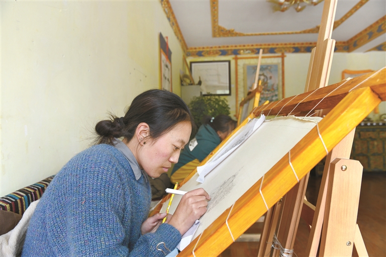 西藏雪堆白傳統(tǒng)手工藝術(shù)學(xué)校創(chuàng)辦至今已有十個(gè)年頭。作為學(xué)校目前最成熟、最系統(tǒng)化的專業(yè),唐卡繪畫專業(yè)吸引了許多前來(lái)學(xué)藝的農(nóng)牧民子女和社會(huì)人士。