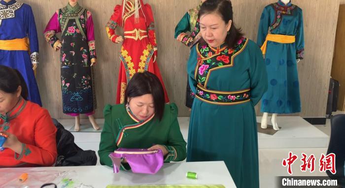 圖為田斯琴高娃正在指導(dǎo)蒙繡技藝。 烏瑤 攝