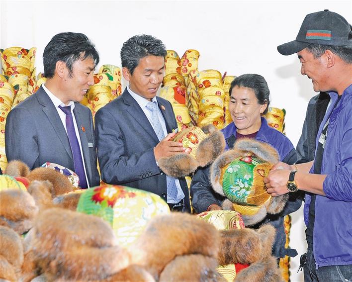 農行山南扎囊縣支行客戶經理(左二)來到扎囊縣扎塘鎮(zhèn)羊嘎村藏式帽子次仁金果農民專業(yè)合作社對接產業(yè)扶貧項目。