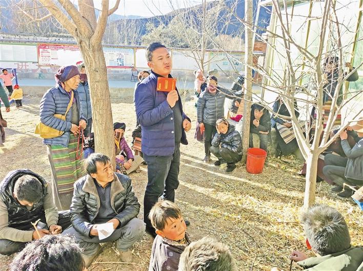 農行山南扎囊縣吉汝營業(yè)所客戶經理(前排站立者)在德吉林村講解精準扶貧政策。