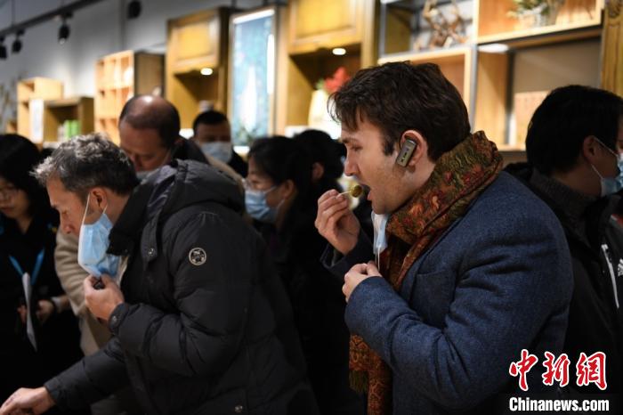 圖為中外嘉賓觀摩隴南市油橄欖產(chǎn)業(yè)時,品嘗加工后的油橄欖果。 閆姣 攝