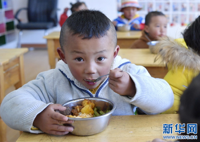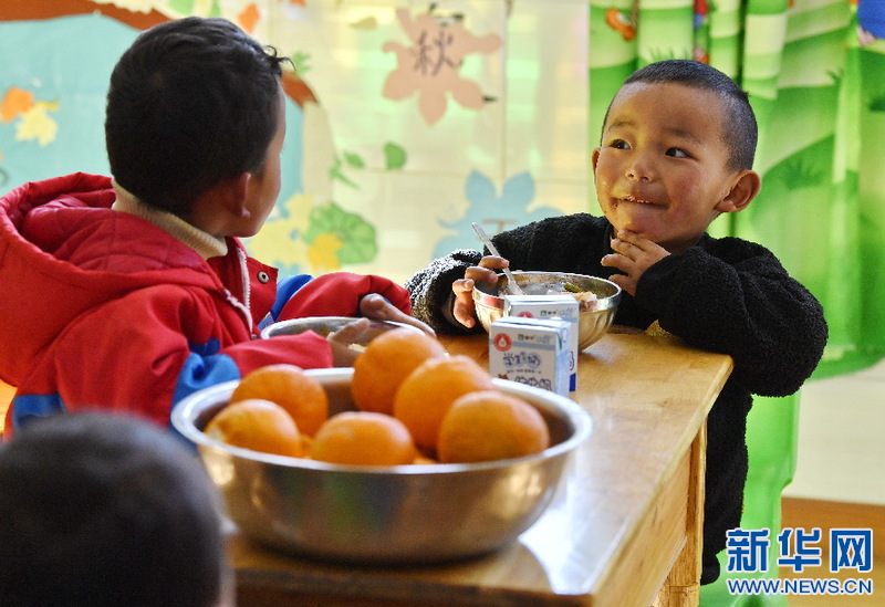 西藏山南市貢嘎縣吉雄鎮(zhèn)紅星社區(qū)雙語(yǔ)幼兒園的孩子吃午餐(11月25日攝)。新華社記者 張汝鋒 攝