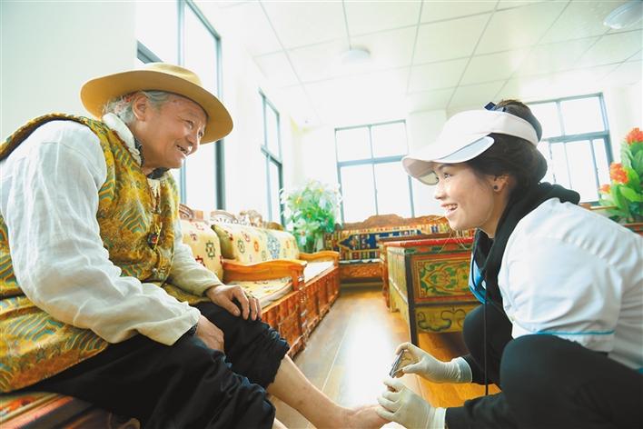 圖為拉薩市墨竹工卡縣特困人員集中供養(yǎng)服務(wù)中心的護(hù)理員在照料孤寡老人。洛克 記者 潘多 攝