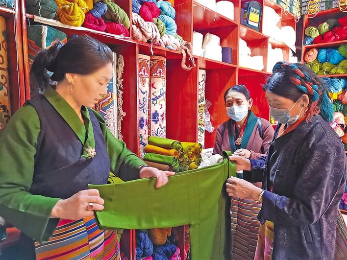 日喀則市仁布縣德吉林鎮(zhèn)德旦康薩傳統(tǒng)手工業(yè)農(nóng)牧民專業(yè)合作社負(fù)責(zé)人旦真愛(ài)人(左一)正在向顧客展示產(chǎn)品。記者 扎西頓珠 攝