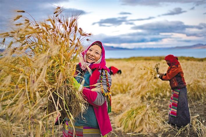 9月23日,西藏那曲市尼瑪縣文部鄉(xiāng)文部南村村民開鐮收割農(nóng)田里的青稞。文部鄉(xiāng)文部南村位于當惹雍錯湖畔,海拔4645米。文部鄉(xiāng)一帶獨特的自然環(huán)境,在以牧區(qū)為主的藏北,造就了這片罕見的農(nóng)田。