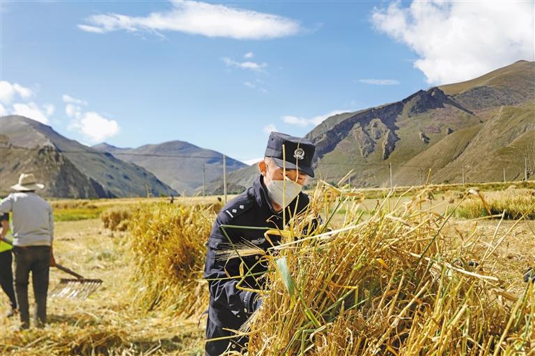 近日,日喀則市康馬縣公安局在統(tǒng)籌安排好工作的同時,組織民輔警志愿者深入南尼鄉(xiāng)楚嘎村田間地頭,幫助缺勞力家庭開展秋收。在豐收的田野上,民輔警志愿者分工明確,有的用背負(fù)式收割機(jī)收割,留下一排排青稞茬;有的將成熟的青稞捆扎,堆積成一排排青稞垛子,進(jìn)行晾曬;有的忙于收集青稞穗,不浪費(fèi)一粒糧食。
