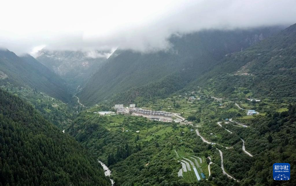 這是錯那市貢日門巴民族鄉(xiāng)斯木村,畫面下方覆蓋地膜處為該村的莓茶種植基地。(無人機照片,7月28日攝)。新華社記者 旦增尼瑪曲珠 攝