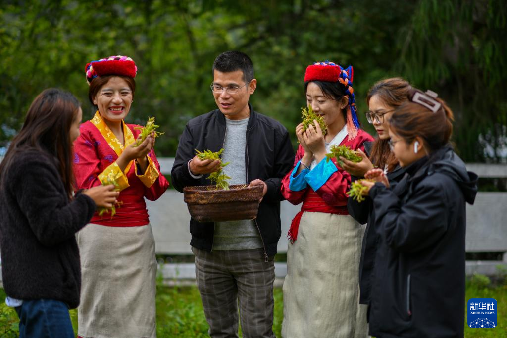 尼瑪卓瑪(左)與村民們在展示采摘到的莓茶(7月29日攝)。新華社記者 旦增尼瑪曲珠 攝