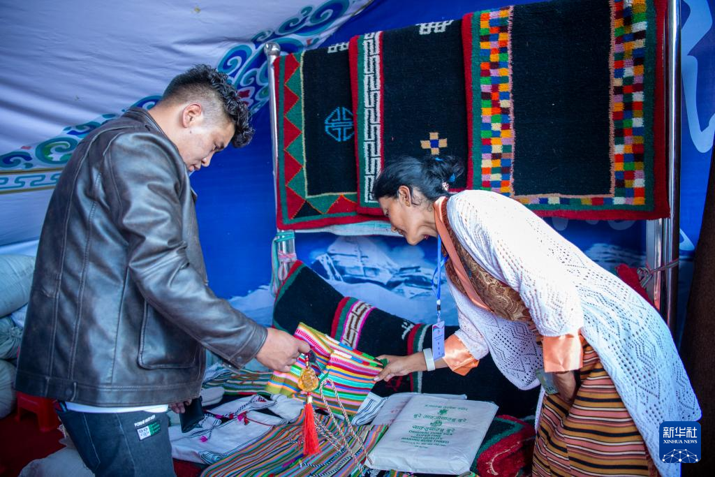 普蘭縣細(xì)德村的村民次仁卓瑪(右)在展銷會(huì)上向顧客介紹產(chǎn)品。新華社記者 劉文博 攝