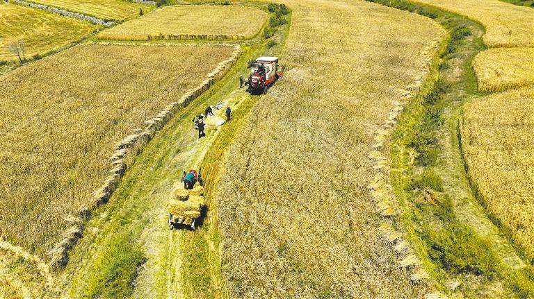 圖為桑普村村民使用機械收割小麥。記者 阿旺尼瑪 攝