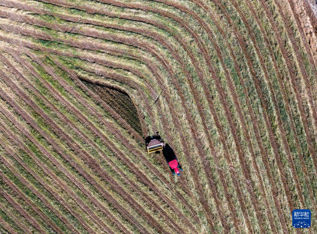 10月24日,村民駕駛農(nóng)機(jī)在拉薩市林周縣強(qiáng)嘎鄉(xiāng)曲嘎強(qiáng)村收割牧草(無人機(jī)照片)。新華社記者 姜帆 攝