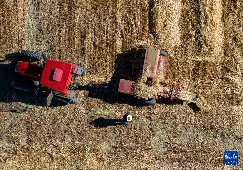10月24日,村民駕駛農(nóng)機(jī)在拉薩市林周縣強(qiáng)嘎鄉(xiāng)曲嘎強(qiáng)村將收割過的牧草打包(無人機(jī)照片)。新華社記者 姜帆 攝