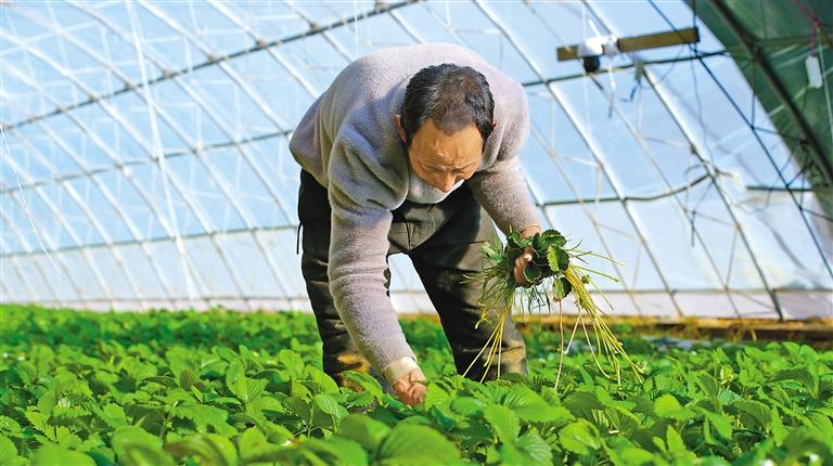 圖為吞彌現(xiàn)代農(nóng)業(yè)產(chǎn)業(yè)園種植人員在草莓種植大棚內(nèi)除雜草。記者 鹿麗娟 攝