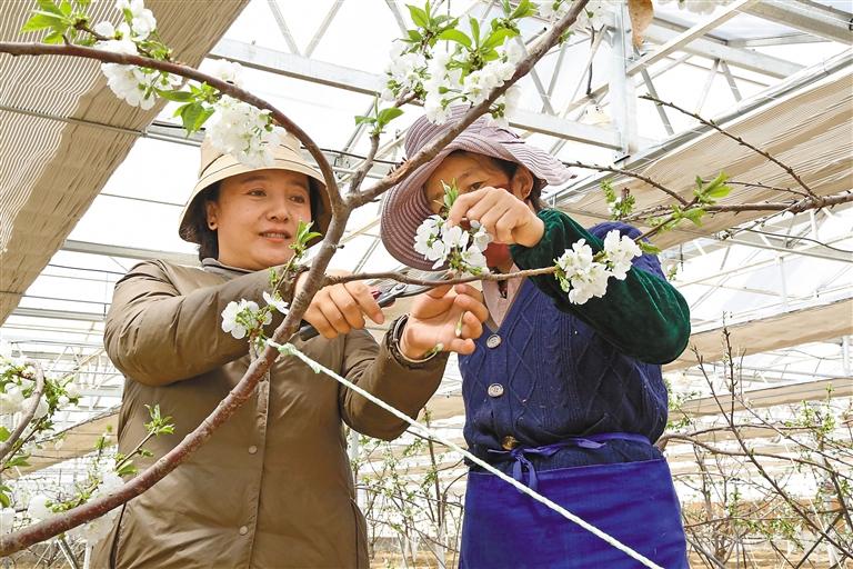 圖為尼木縣“點(diǎn)對點(diǎn)”干部王榮華(右一)向群眾傳授平谷大桃種植技術(shù)。