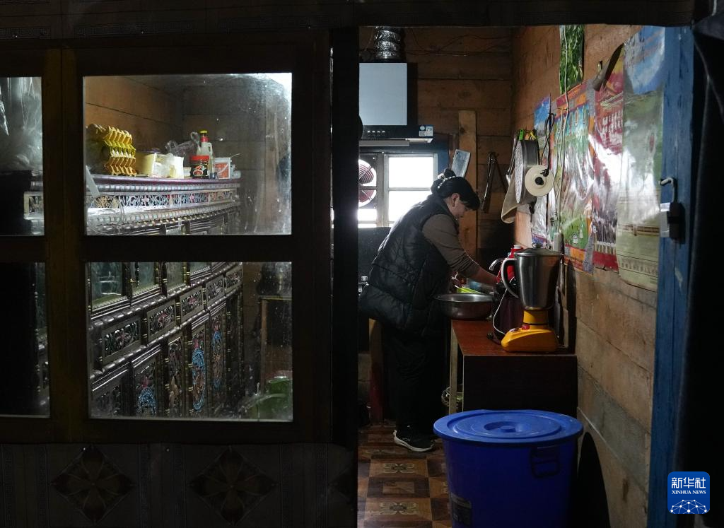 洛松頓珠的母親次吉在廚房?jī)?nèi)為旅客準(zhǔn)備晚餐(4月2日攝)。新華社記者 丁汀 攝