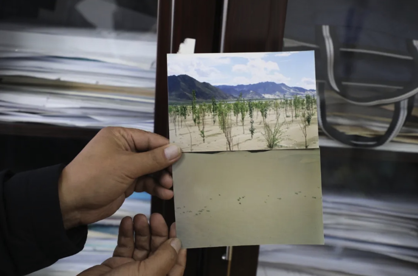 “過(guò)去,扎囊縣扎其鄉(xiāng)德吉新村一帶公路兩旁全是沙丘,風(fēng)一吹,路過(guò)的車(chē)輛經(jīng)常陷進(jìn)沙里無(wú)法行駛?!?/p>