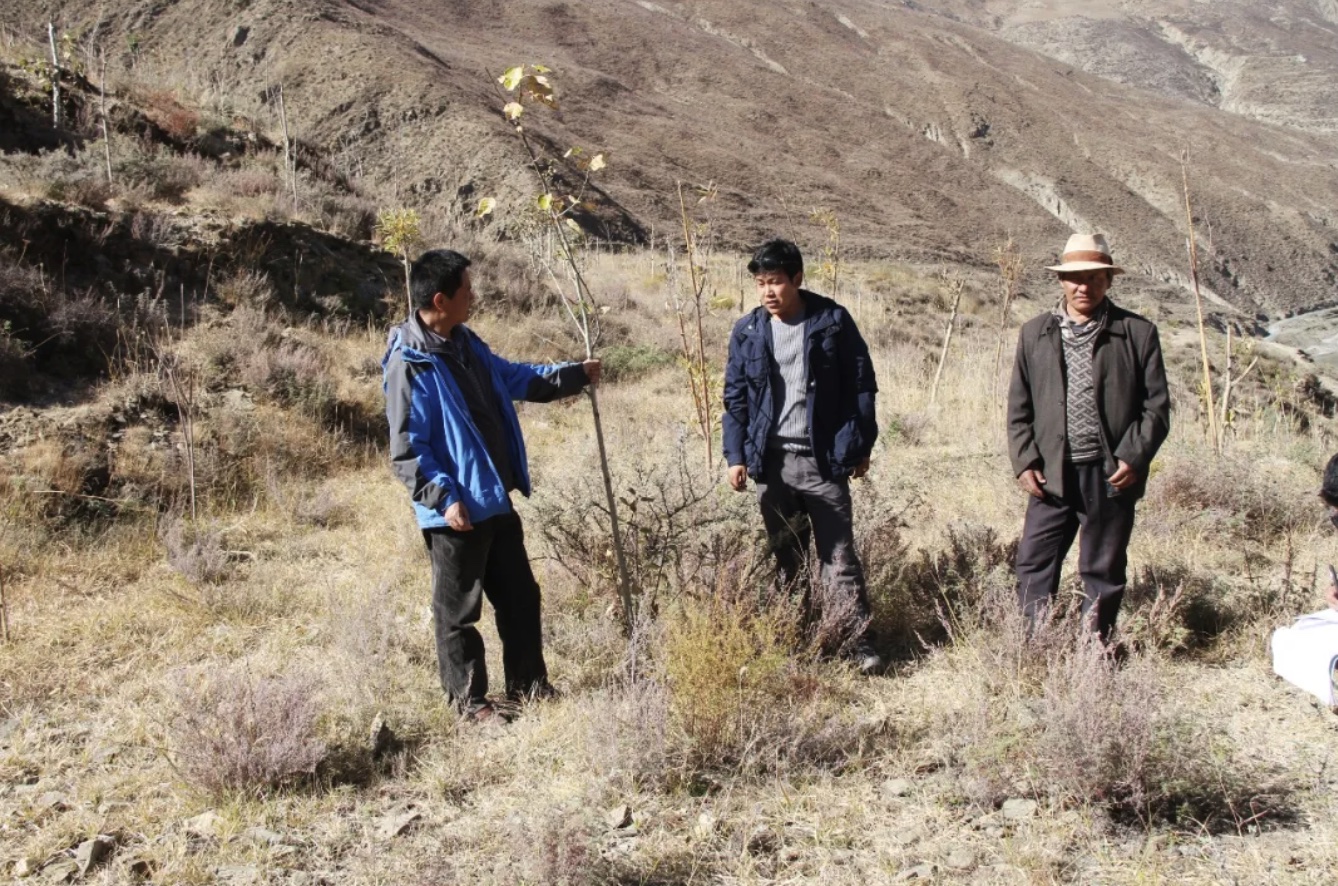 圖為尼瑪次仁(左一)查看樹(shù)苗生長(zhǎng)情況。(圖片由受訪者本人提供)