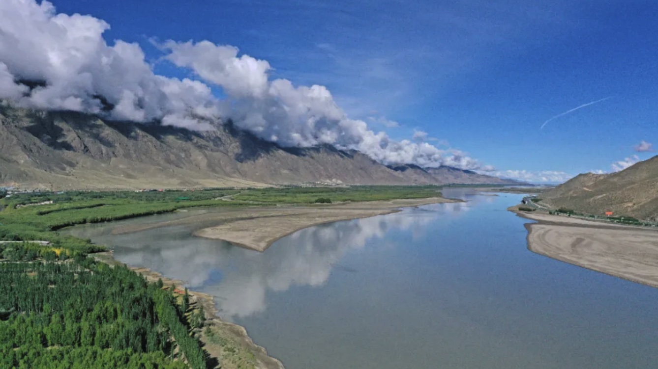 雅魯藏布江流入山南境內(nèi),河谷變寬,水流變緩,冬春季節(jié),河道裸露,大風(fēng)一起,黃沙漫天。