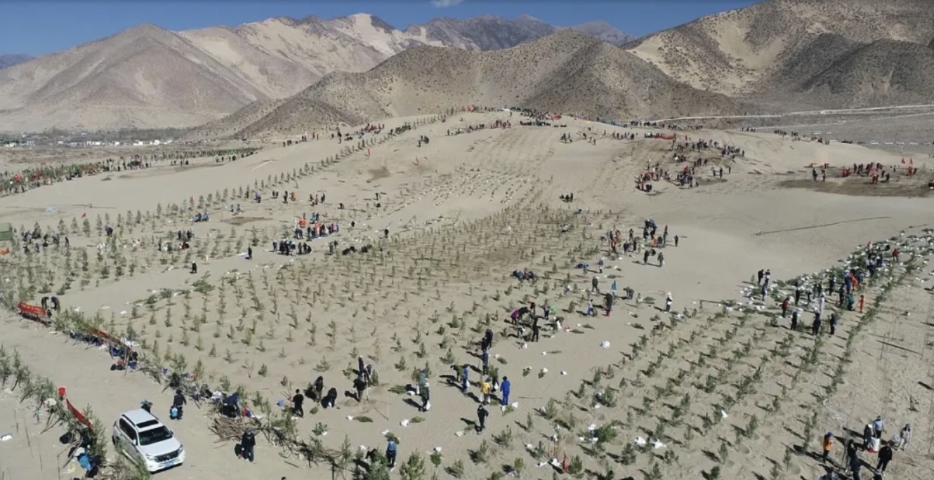 彼時(shí)的雅江中游河畔是一片土地沙化嚴(yán)重、風(fēng)沙肆虐的荒蕪之地。據(jù)原山南地區(qū)林業(yè)局局長(zhǎng)李純祿回憶:離江較近的農(nóng)田風(fēng)蝕嚴(yán)重,有的地塊一年要重播兩三次。附近草場(chǎng)沙化嚴(yán)重。有時(shí)沙塵暴卷起的揚(yáng)沙達(dá)數(shù)十米甚至數(shù)百米之高,遮天蔽日,天昏地暗。