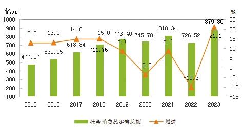 全年社會(huì)消費(fèi)品零售總額879.80億元,比上年增長21.1%。按銷售單位所在地分,城鎮(zhèn)消費(fèi)品零售額716.67億元,增長19.5%;鄉(xiāng)村消費(fèi)品零售額163.14億元,增長28.8%。按消費(fèi)形態(tài)分,商品零售789.54億元,增長19.9%;餐飲收入90.27億元,增長32.4%。