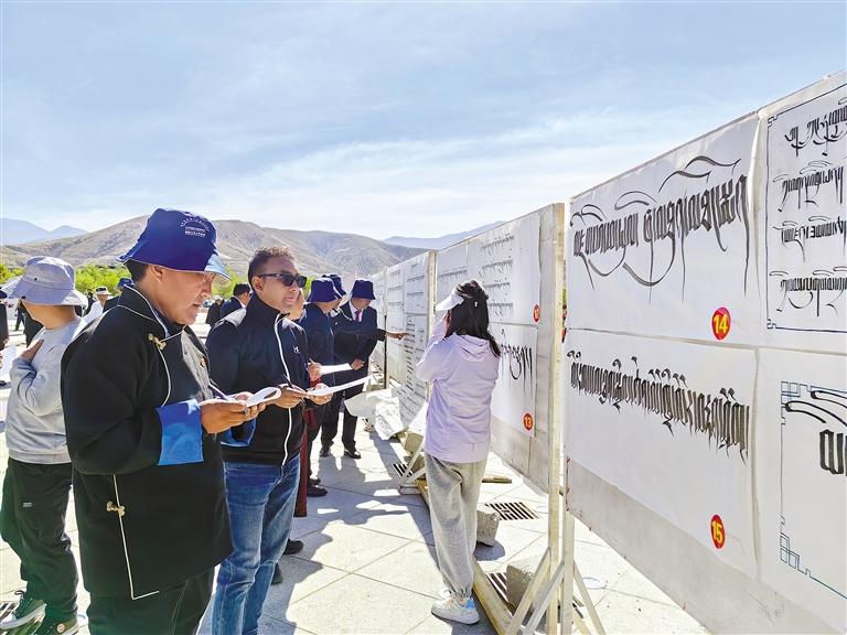 圖為在謝通門(mén)縣開(kāi)展的書(shū)法、繪畫(huà)、攝影比賽中,評(píng)委在為作品打分。