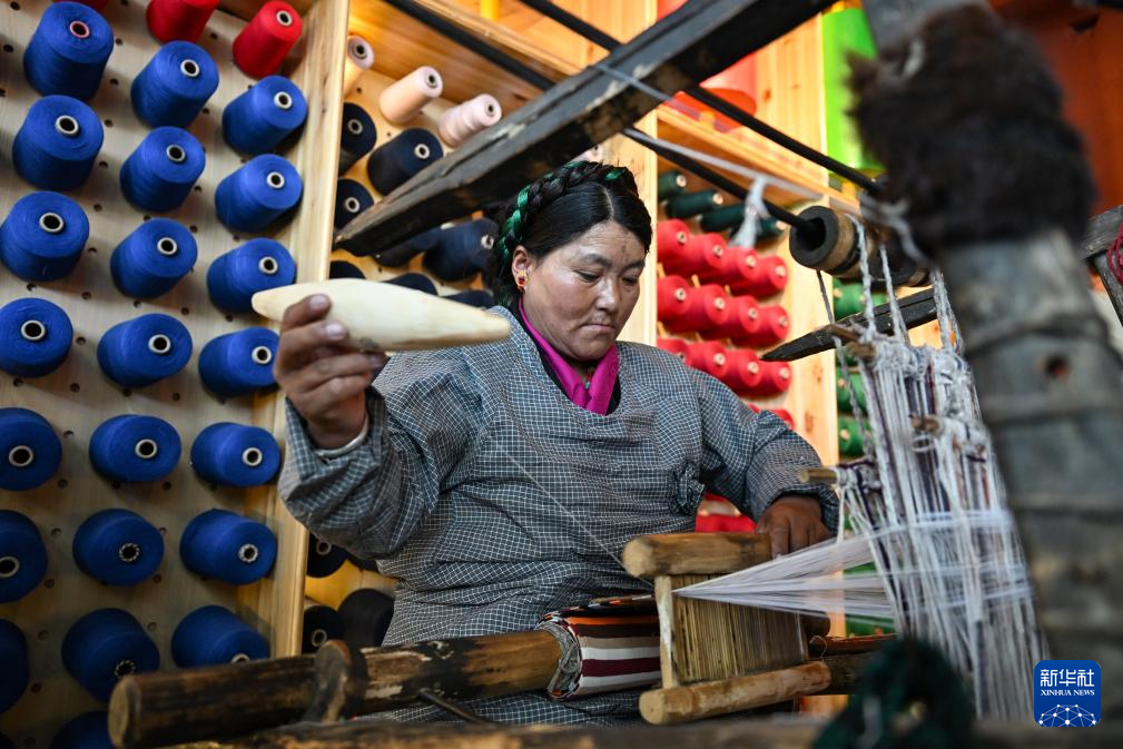 在西藏日喀則市江孜縣班覺倫布村的阿佳格桑工坊,手工藝人阿佳格桑使用新式織機編織氆氌(9月3日攝)。新華社記者 孫瑞博 攝